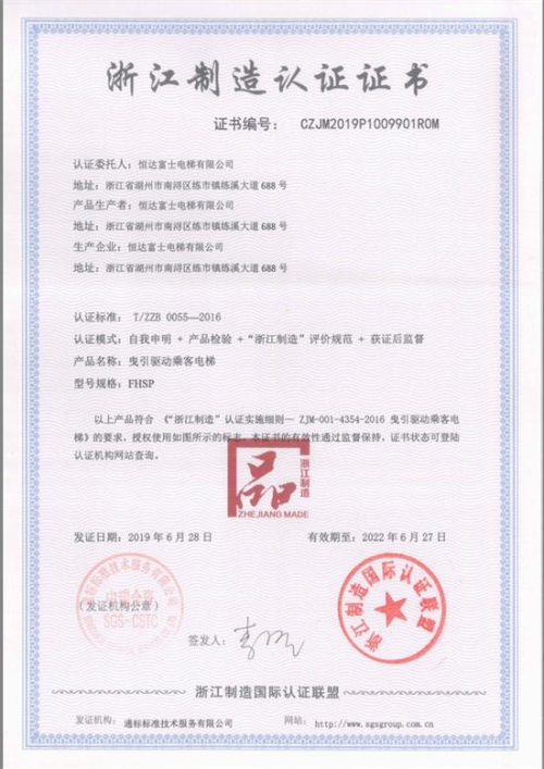 近日,通过“高标准+严认证”,恒达富士电梯有限公司的销售明星梯型——FHSP型号的曳引驱动乘客电梯顺利获得“浙江制造品字标”认证证书。
