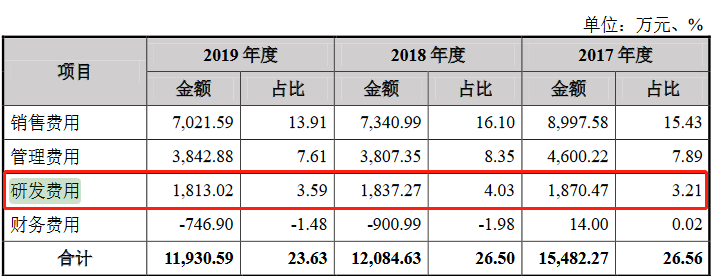 森赫电梯近三年的研发费用分别为1870万元、1837万元、1813万元,分别占营收的3.21%、4.03%、3.59%。