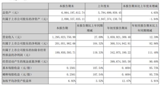 挖贝网 10月28日,康力电梯(002367,股吧)(002367)发布2020年三季度报告,公告显示2020年1-9月实现营收3,059,921,309.40元,同比增长12.39%;归属于上市公司股东的净利润368,514,942.81元,同比增长82.86%。其中第三季度归属于上市公司股东的净利润201,051,982.66元,同比增加104.32%。