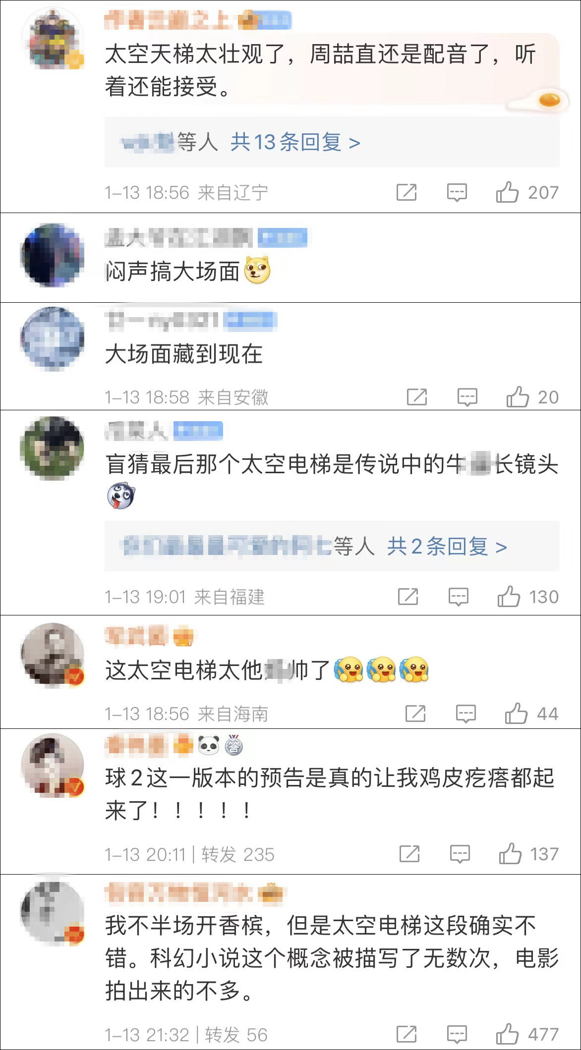 有人调侃导演郭帆闷声干大事,这么大场面竟然藏到最后一刻才公布,直呼这满足了大家对太空电梯的想象,“太酷了!看得起鸡皮疙瘩了!”