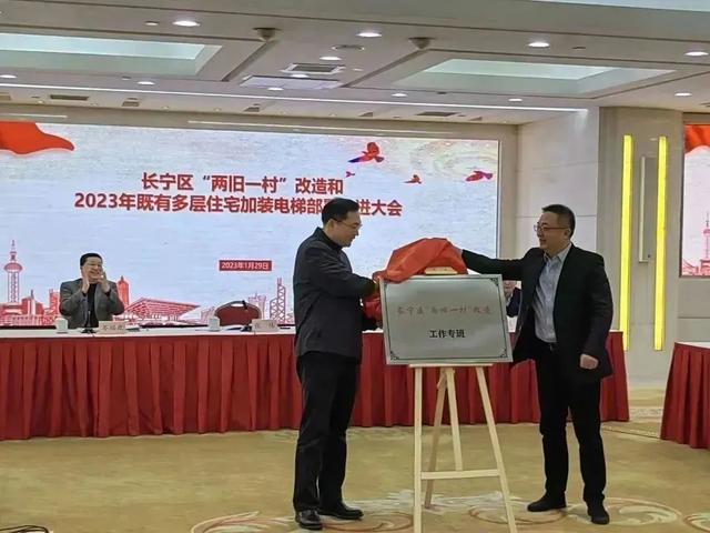 会上,张伟和林伟斌共同为区“两旧一村”工作专班正式揭牌,吹响了全面启动“两旧一村”改造的号角。同样作为重大民生工程的加装电梯,陆浩宣读了区加装电梯红榜代建单位名单。会上,区房管局将“两旧一村”和2023年加装电梯工作进行了部署,各街镇领取了目标任务责任书。江苏路街道、仙霞新村街道、虹桥街道、新泾镇、区规划资源局、新长宁集团做了交流发言。