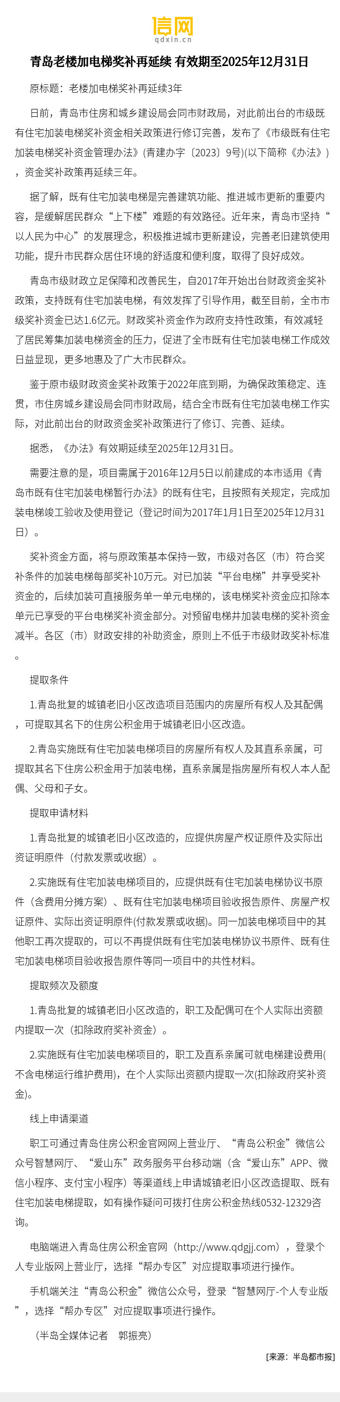 【青岛老楼加电梯奖补再延续 有效期至2025年12月31日】奖补资金方面,将与原政策基本保持一致,市级对各区(市)符合奖补条件的加装电梯每部奖补10万元。