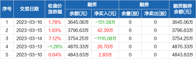 融资方面,当日融资买入1454.35万元,融资偿还1605.93万元,融资净偿还151.58万元。融券方面,融券卖出0股,融券偿还0股,融券余量0股,融券余额0元。融资融券余额合计3645.06万元。