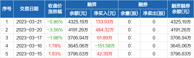融资方面,当日融资买入586.51万元,融资偿还452.58万元,融资净买入133.93万元,连续3日净买入累计680.13万元。融券方面,融券卖出0股,融券偿还0股,融券余量0股,融券余额0元。融资融券余额合计4325.19万元。