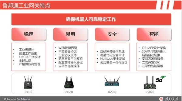 其中鲁邦通R5020为5G网关,可以将5G高带宽、低时延和广连接的三大特性用到机器人与平台的通讯中,实现移动宽带增强,超可靠通信低延时和海量机器类通信。