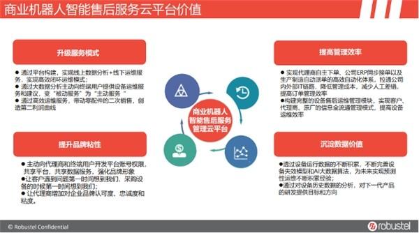 针对以上四大痛点,鲁邦通推出商业机器人智能售后服务云平台,该平台可以对机器人设备进行全生命周期维护管理,并提供决策和预测的智能化分析报表,支持设备高效运维作业。为客户升级服务模式、提升品牌粘性、提高管理效率和沉淀数据价值。
