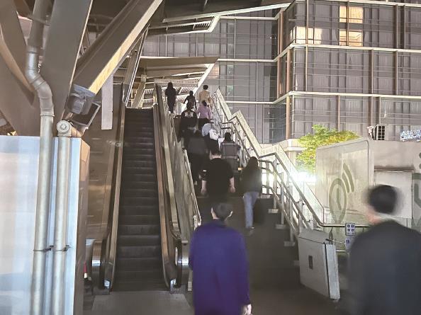 记者来到虹桥火车站探访调查。此时虽已接近深夜,站内却依然人来人往。记者发现,站内地下3层至地面1层的自动扶梯包括无障碍电梯都在运行着,但跟随着熙熙攘攘的人流来到地面1层的出口处可以发现,一出门口便是跨街天桥,天桥横跨申虹路,对面连接着虹桥天地南北两区的商业广场,通道中间装有两部自动扶梯,外侧两边则为楼梯,和站内不同的是,此处的自动扶梯已经停运了,旅客们想要通过,需要爬上一段楼梯上至天桥后再前往对面。