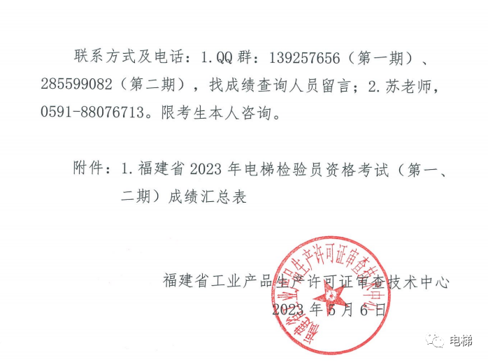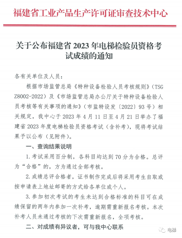 近期福建省公布了其在2023年4月11日至4月21日举办了电梯检验员考试成绩。