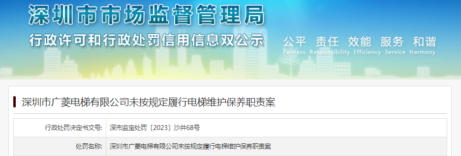 中国质量新闻网讯 近日,深圳市市场监督管理局宝安监管局公布一条行政处罚信息,涉及深圳市广菱电梯有限公司未按规定履行电梯维护保养职责案。具体信息如下:
