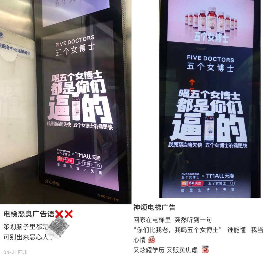 每天出行乘坐电梯时,我们总会被迫看见电梯里各类广告,“洗脑”的、打擦边球的……在“五个女博士”胶原蛋白饮品的电梯广告里,只见几名女性怒吼着:“老公气我,喝”“熬夜追剧,喝”“又老一岁,喝”,诸如此类的文案彻底惹怒了一众网友。