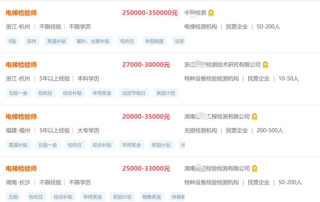 我们再看下检验师的待遇,5家电梯检测公司招聘检验师,给的月薪从2万-3.5万元,有家开的年薪是25万-35万。这样看电梯检验师的年薪在24-42万之间,比电梯检验员待遇高的多。当然持证4年的电梯检验师更吃香,持证8年及以上的电梯检验师最吃香。