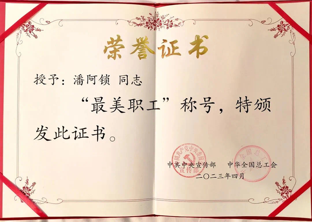 潘阿锁获得中共中央宣传部、中华全国总工会联合颁发的“最美职工”证书