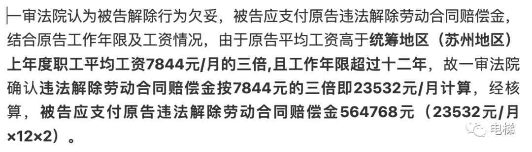 再后来雷某就去法院把通力电梯给起诉了,一审法院判决通力电梯向雷某支付违法解除劳动合同赔偿金564768元。这个564768元的算法如下: