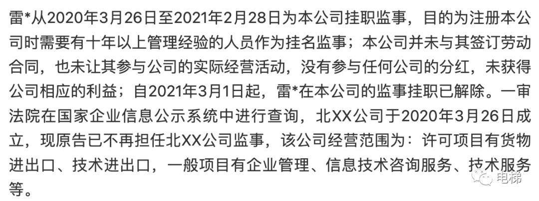 2021年6月21日,雷某挂职监事的公司向通力电梯出具证明,载明: