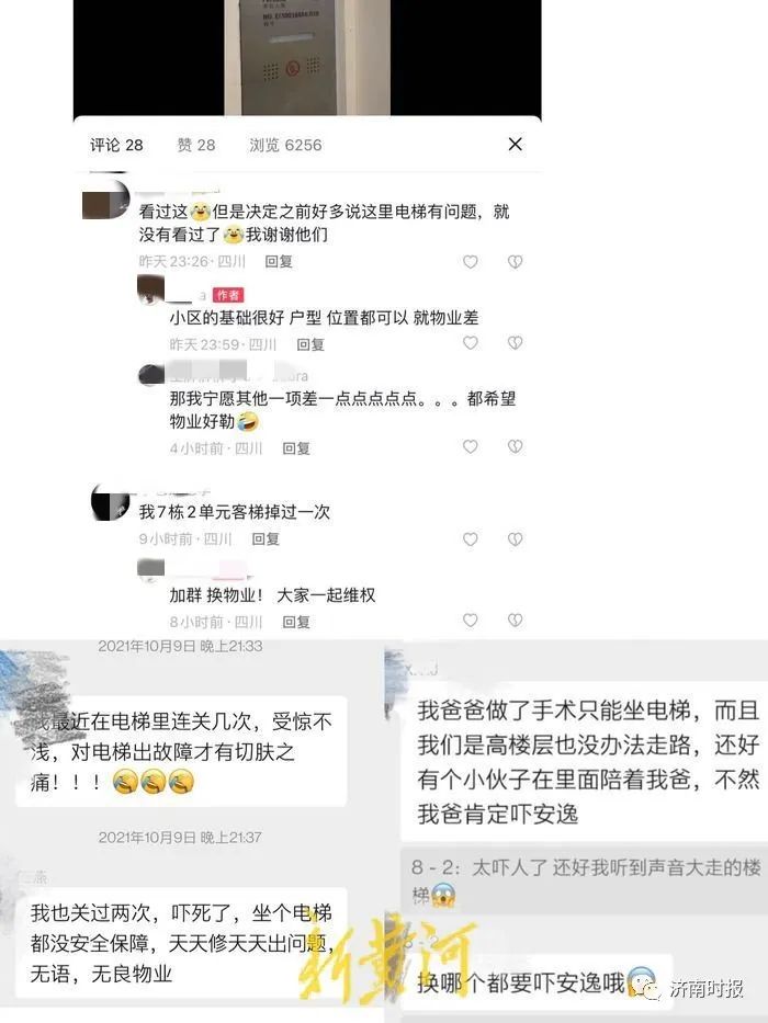 “我家住在14楼,上周六早上我乘坐电梯外出,到3楼的时候电梯突然骤降,一下掉到了负一楼。电梯停住后,我按下开门按钮,但门怎么也打不开,我只能按警铃。”曾先生是8栋楼2单元的业主。据他反映,当时被困在电梯里大约20分钟后,物业方才带着维保工作人员前来打开电梯门,将其救出。“这已经是我第二次被困在电梯里,这一次因为电梯骤降,我真的被吓到了。”事发后,曾先生通过业主群了解到,仅他们那一单元,有过类似遭遇的业主就不下十户。