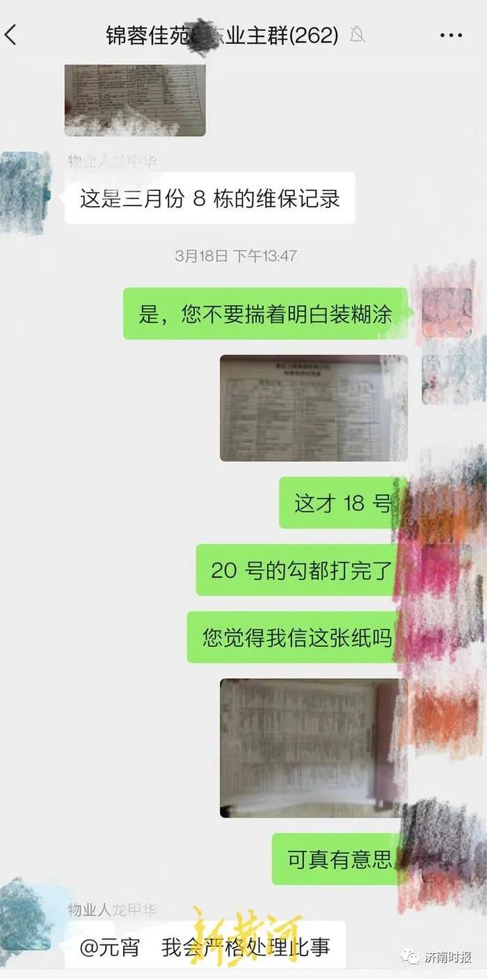 唐女士告诉记者,3月18日当天因一位邻居被困,于是业主们要求物业方提供近期的电梯维保记录。“物业将电梯维保记录拍照发在群里,当天是3月18号,可是我发现他们的维保记录竟然填到了20号,并且签好了字。”根据唐女士提供的业主微信群的聊天记录截图显示,该小区物业工作人员发来的电梯维保记录登记表日期显示为3月20日,但双方对话日期为3月18日,针对唐女士的质疑,安吉物业工作人员称将严格处理此事,但并未公布处理结果。
