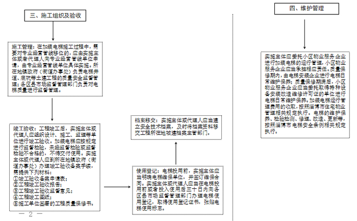 (一)施工管理。实施主体或代理人对加装电梯质量安全负总责,设计、施工、监理单位、安装单位和电梯企业等单位依法履行义务、承担责任。在加装电梯施工过程中,需要对专业经营管线移位的,应由实施主体或代理人向专业经营管线单位申请,由专业经营管线单位具体实施。所在地镇政府(街道办事处)负责电梯井道、底坑等土建工程的质量安全监督管理;各区县市场监督管理部门负责对电梯安装及质量进行监督管理。