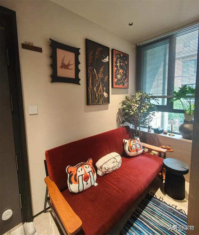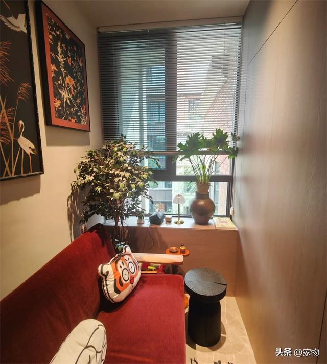 比起很多同类型的一梯一户来说,这里最大的优势便是有扇大窗户,做个板材装饰窗台,在这里养花种草,观星吹风,甚至坐在沙发上喝喝茶,和朋友聊聊天都没问题,只看这一隅,很难相信是在电梯间内。
