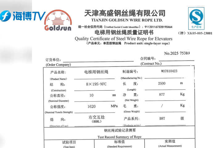 记者联系天津高盛厂家核实,对方确认电子档合格证对应的产品确实为其生产。但业主仍有疑问:“配货流程为何会出错?若业主未发现,不合格或错配的钢丝绳是否就直接安装了?”维保单位承认,货物由物流直接卸货,工作人员尚未核查就被业主发现问题,流程存在疏漏。