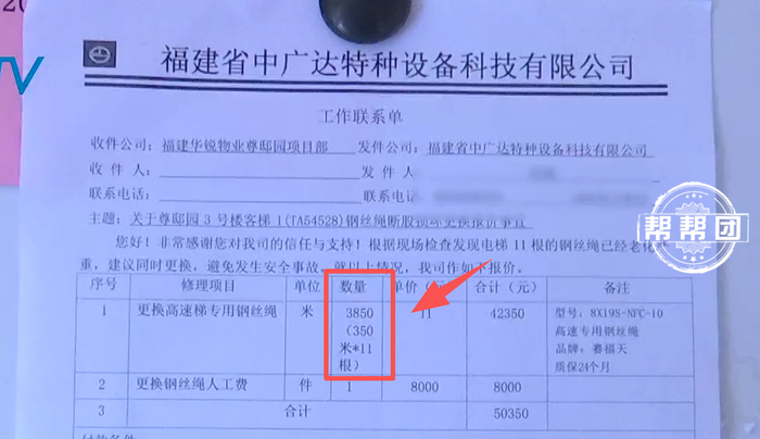 一波未平一波又起,业主后续发现,首批钢丝绳的合格证标注长度为2500米,而电梯维修工作联系单显示需更换的钢丝绳长度为3850米。对此,维保方辩称“合格证是分批出具的”,但剩余1300多米的合格证明迟迟未提供,业主对采购流程的合规性提出进一步质疑。