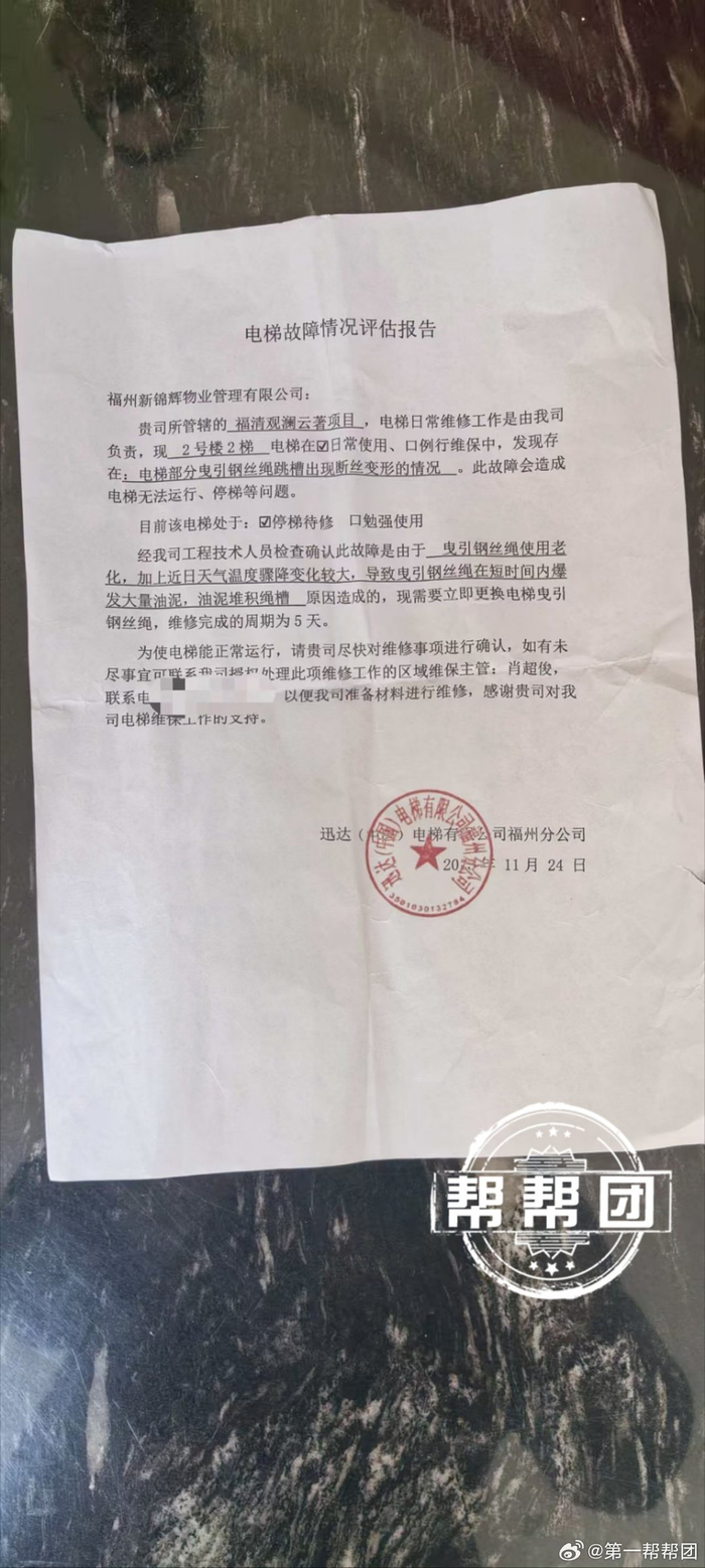 【电梯维保12天后钢丝绳即出现损坏 业主认为维保不到位拒动公维金 维保单位解释故障原因并愿承担费用】#电梯维保12天后钢丝绳损坏#近日,福州市福清县金辉光澜云著2号楼的业主向《帮帮团》栏目反映,11月23日,楼栋内的1号梯坏了,经维保单位检查,有根钢丝绳脱离滑槽且有断丝、变形的情况,需要对整组7根钢丝绳进行更换。物业提出需动用公共维修基金进行维修,部分业主疑惑,11月10日,电梯维保单位刚对该梯进行年度维保,项目上都显示正常,为何没过几天电梯就出现故障?对此,电梯维保单位人员表示,电梯损坏有多方面原因,这次的主要原因是因为天气降温,钢丝绳内的润滑油脂析出凝结,导致钢丝绳脱轨。在接到业主投诉后,当地的宏路市场监督管理所的工作人员曾到现场检查,工作人员称,钢丝绳脱轨的原因与维保单位所述一致。当天,经业委会与物业、维保单位三方协调,维保单位称,考虑到用户体验及品牌效益,愿与物业方共同承担更换钢丝绳的费用。Via@第一帮帮团